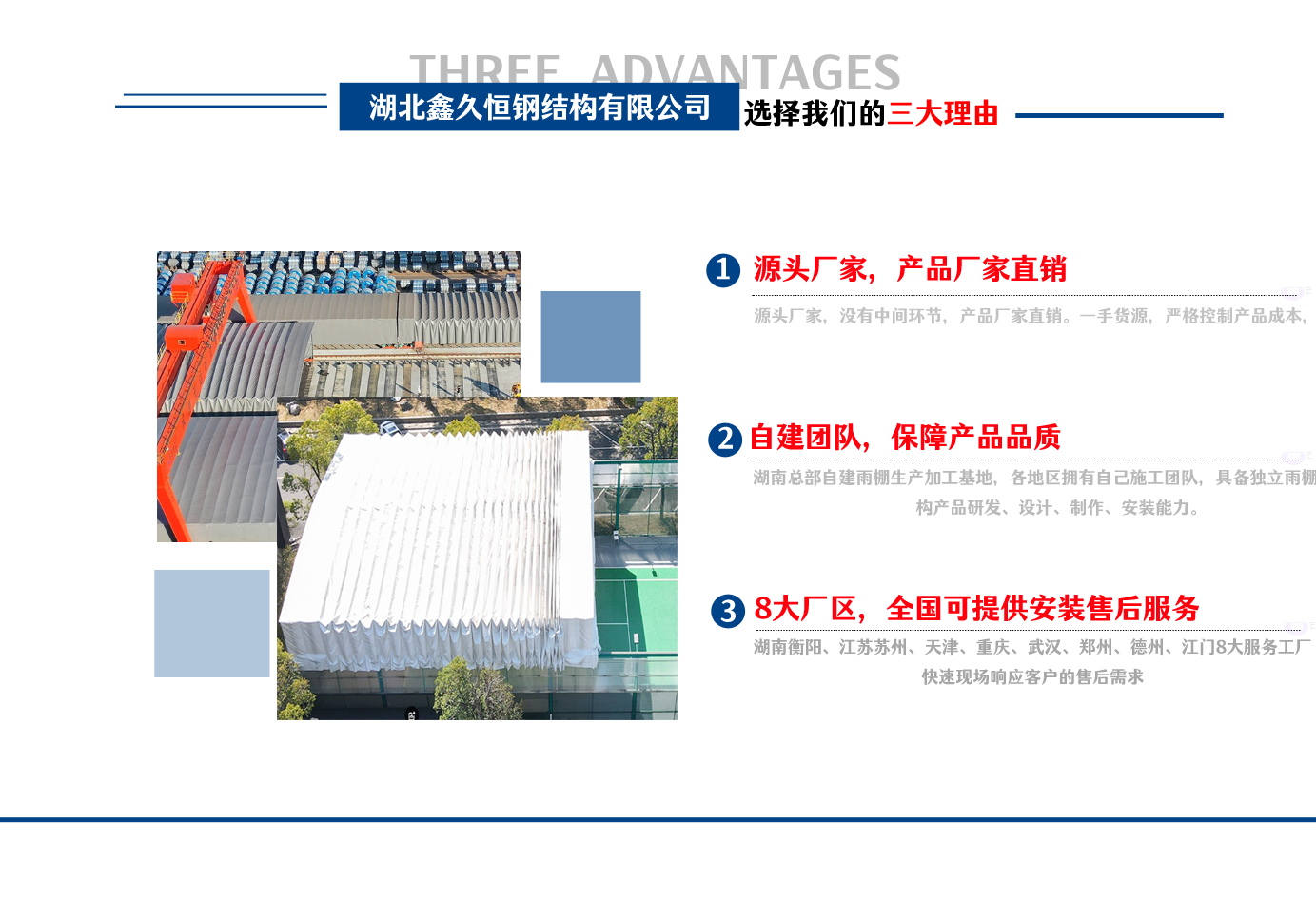 湖北鑫久恒鋼結構有限公司是一家電動雨棚、膜結構車棚研發(fā),生產(chǎn)銷售,施工安裝于一體的專業(yè)鋼結構科技公司,主要產(chǎn)品有伸縮雨棚,電動雨棚,膜結構車棚等。 湖南地區(qū)職員目前有80多人,占地面積20000平方米,廠房面積15600平方米,配備先進的生產(chǎn)流水線,使每件品質(zhì)產(chǎn)品的堅實基礎。 公司在蘇州、天津、重慶、武漢、德州、烏魯木齊、江門均設有服務工廠,總?cè)藛T共300多人,擁有專業(yè)的技術團隊,配備先進的設備和流水線生產(chǎn),產(chǎn)能高,貨源充足,發(fā)貨速度快,服務區(qū)域廣。 移動伸縮棚適用于通道臨時倉儲、戶外運動遮陽、污水池遮蓋、能源交通、熱力化工、礦山、船舶制造及市政建設、物流、碼頭等領域的構件制作加工,成品半成品存放、倉庫、野外儀器設備操作用房等。尤其是對工廠發(fā)貨、倉儲臨時遮雨防嗮,梅雨期較長、建設周期較短的工程施工等特別適用。還可根據(jù)用戶需求量身定制、適合企業(yè)所需不同款式的產(chǎn)品。 我公司堅持“誠信社會為本,客戶滿意為榮”的經(jīng)營理念,做到質(zhì)量把控,嚴格管理,精益求精,恪守承諾。使鑫久恒逐步走向成熟,其系統(tǒng)化、專業(yè)化日趨完善。以專業(yè)的技術、科學的管理,更高的產(chǎn)品質(zhì)量,優(yōu)良的企業(yè)信譽,真誠的客戶服務,靈活多樣的經(jīng)營方式和務實創(chuàng)新的企業(yè)精神愿與社會各界攜手合作,為推動智能鋼結構建筑事業(yè)的發(fā)展而不斷努力。...